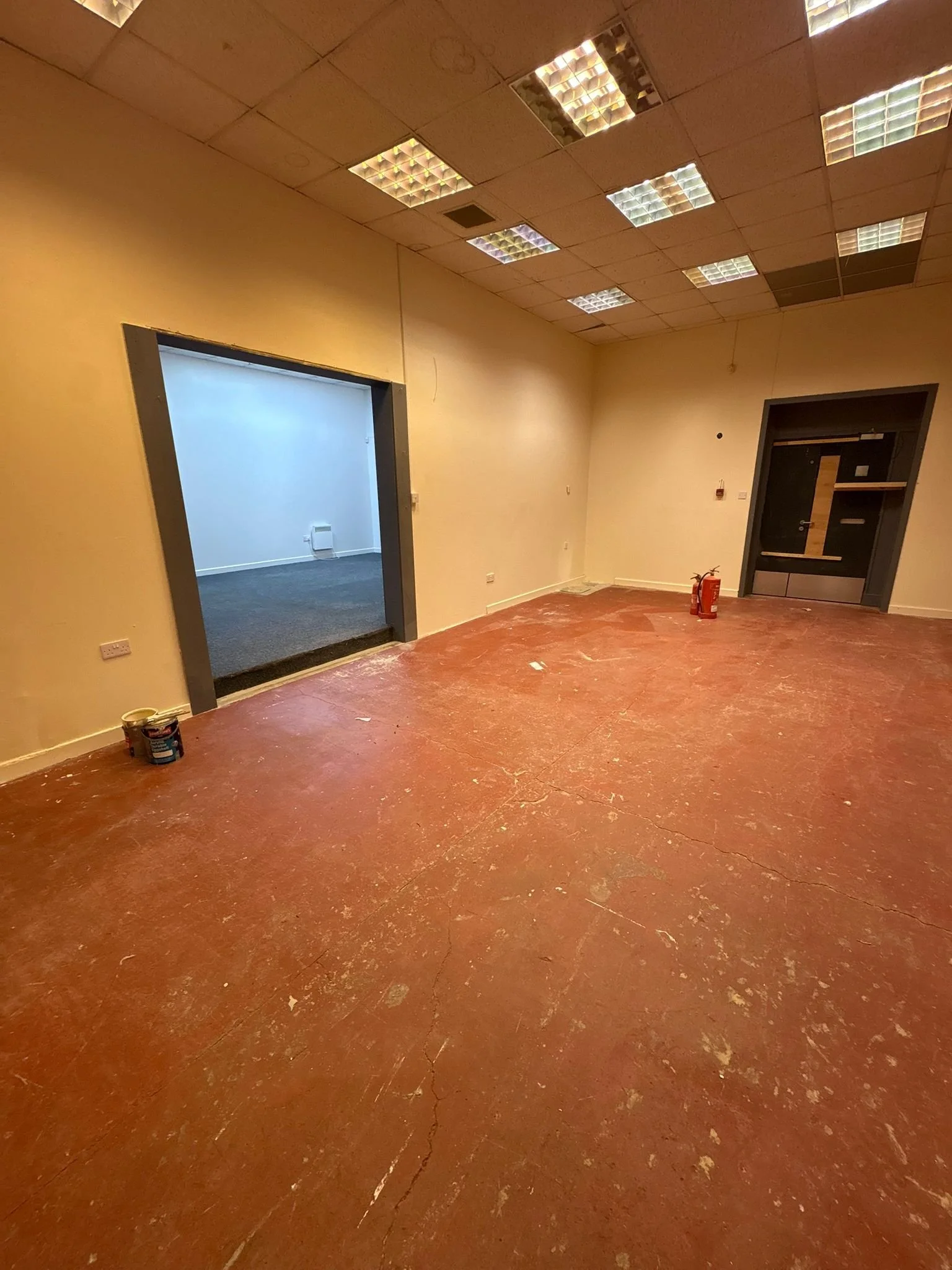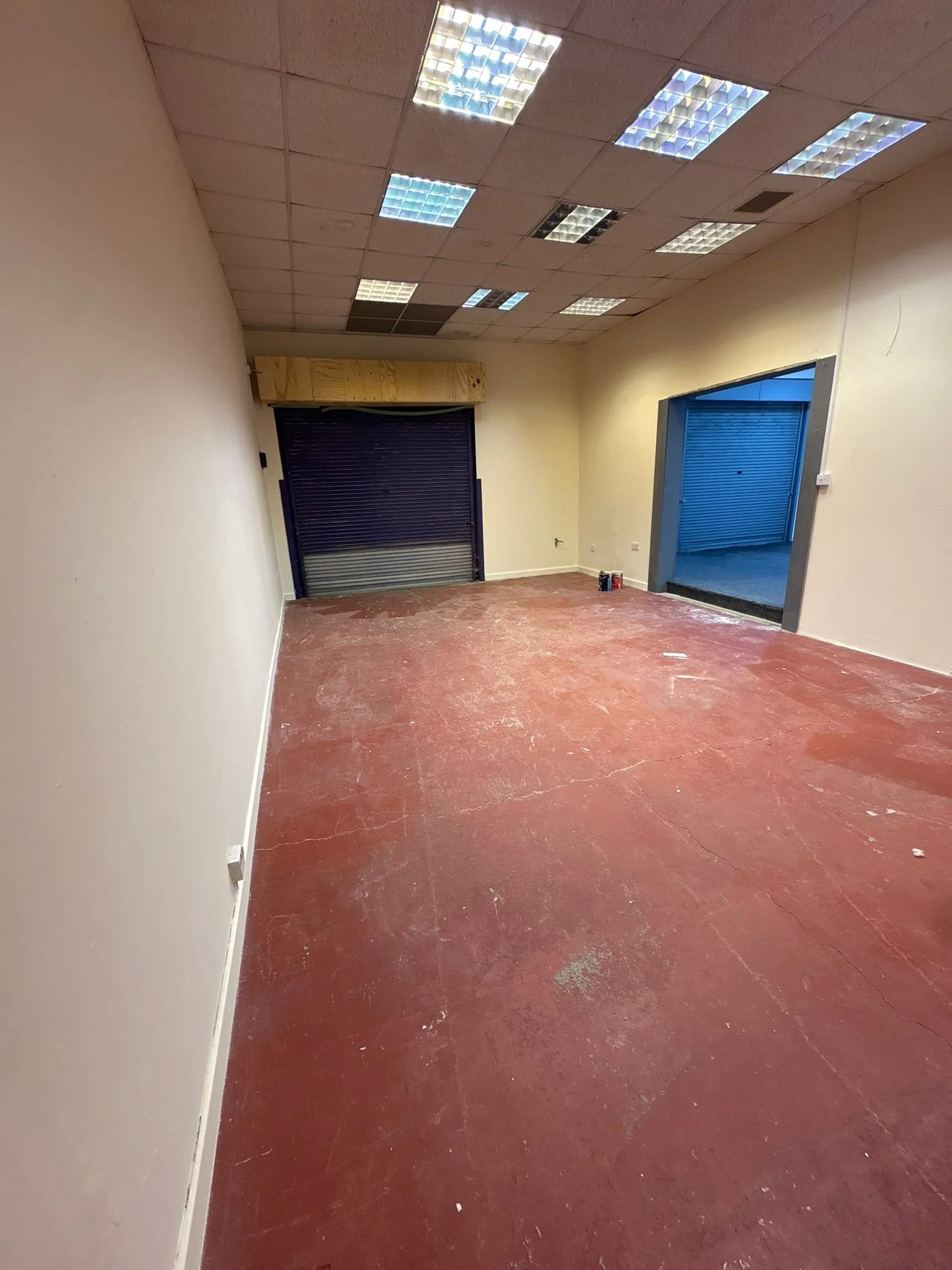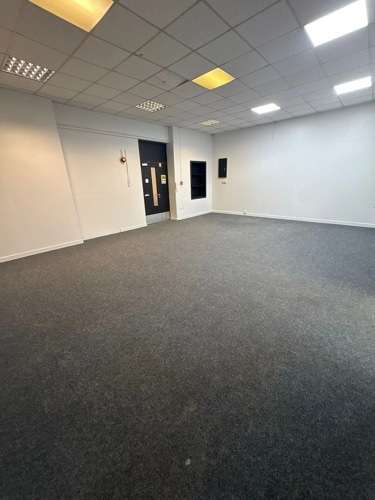 The accommodation is split across three interconnected units, each approximately 500 sq ft, featuring neutral décor, suspended ceilings with integrated lighting, and a mix of carpeted and solid flooring throughout. Secure roller-shutter doors provide easy access, while the layout allows for both open-plan and segmented work areas to suit tenant requirements.