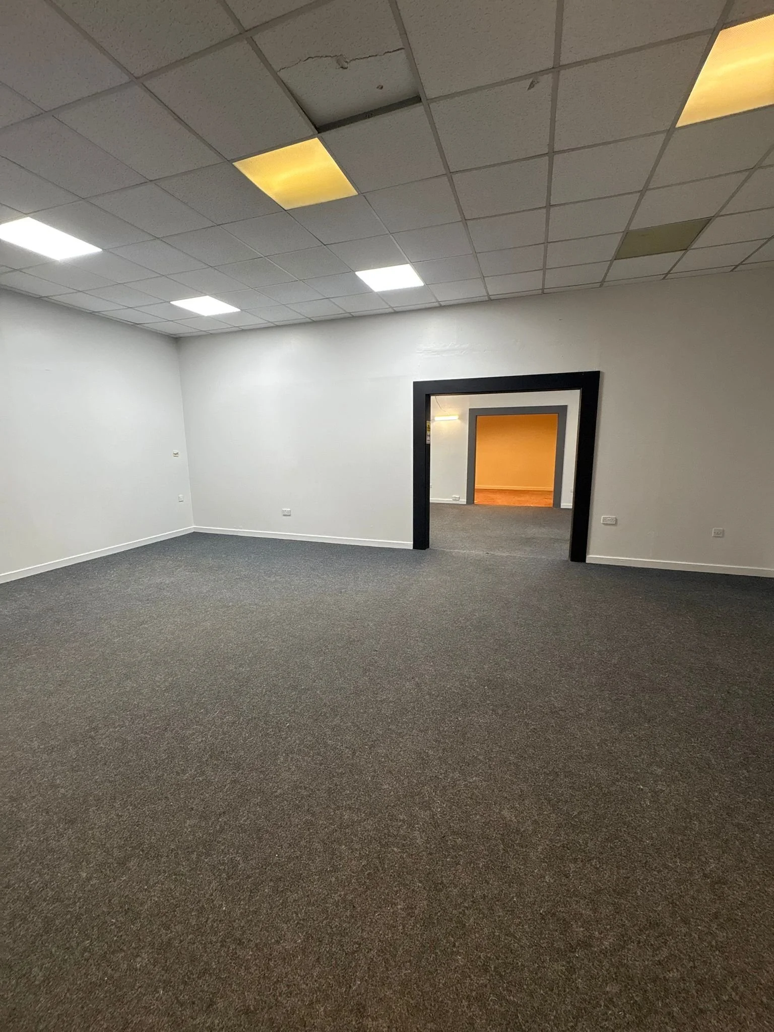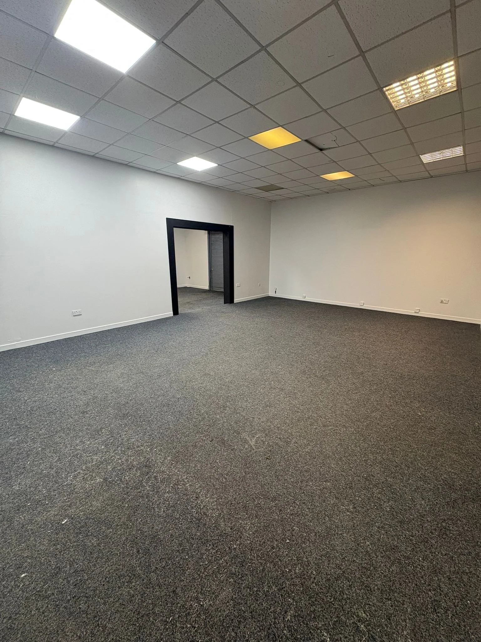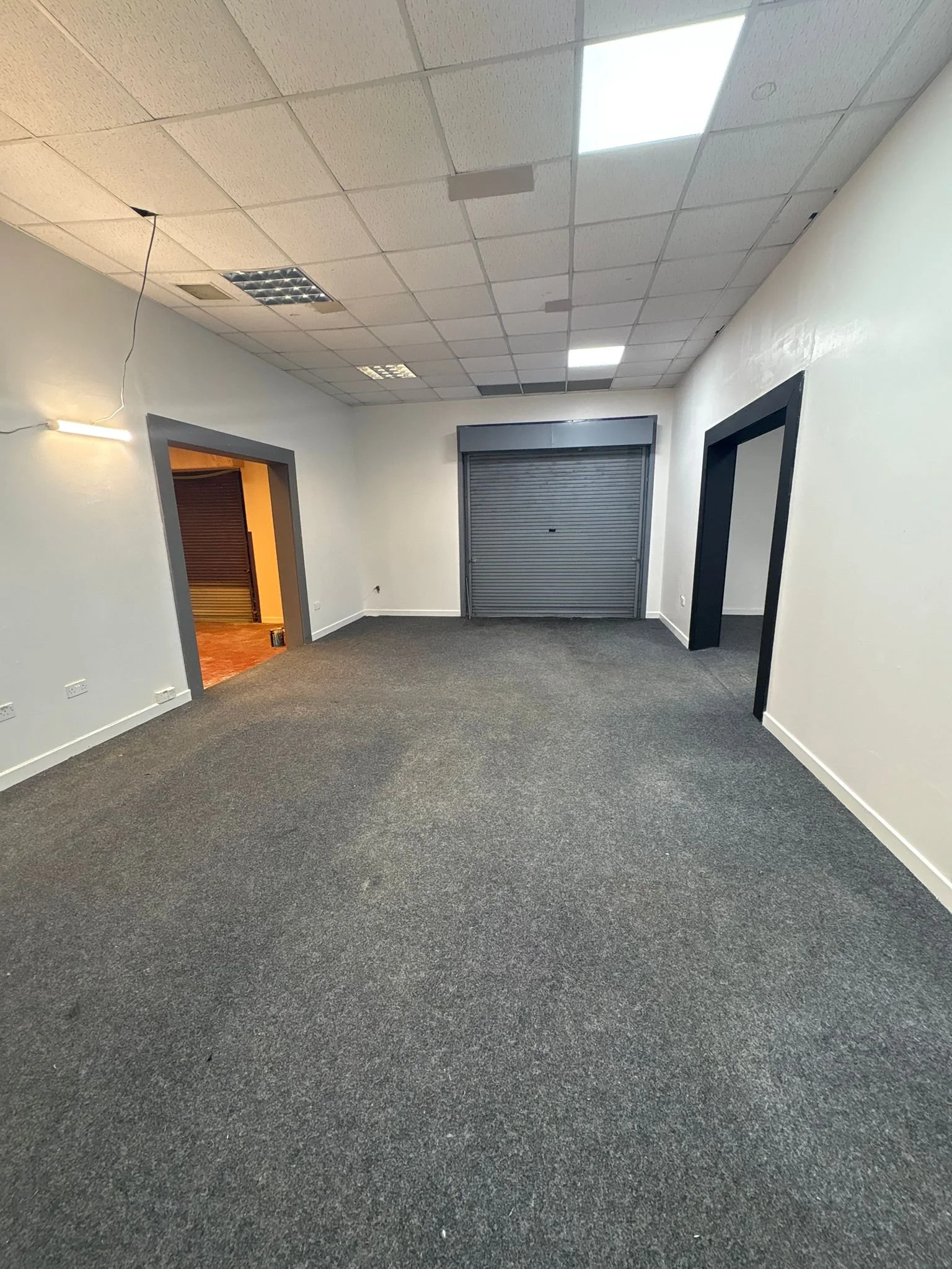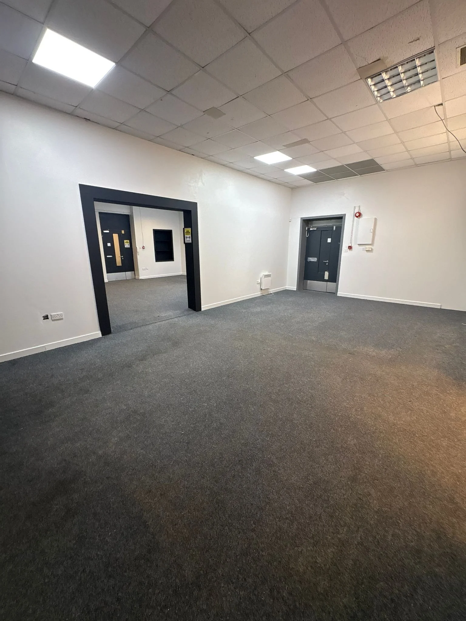 The accommodation is split across three interconnected units, each approximately 500 sq ft, featuring neutral décor, suspended ceilings with integrated lighting, and a mix of carpeted and solid flooring throughout. Secure roller-shutter doors provide easy access, while the layout allows for both open-plan and segmented work areas to suit tenant requirements.